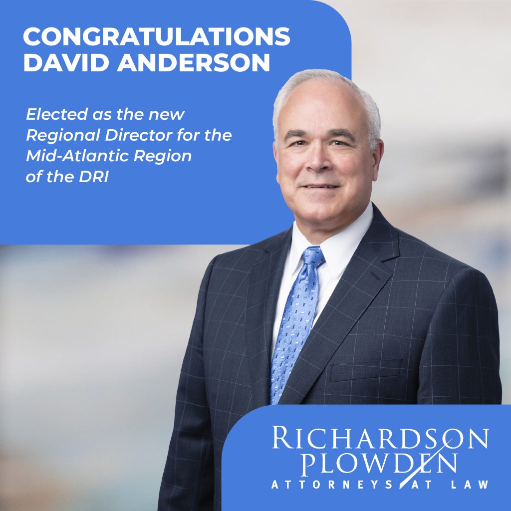 Richardson Plowden is pleased to announce that attorney David A. Anderson was recently elected as the new Regional Director for the Mid-Atlantic Region of the DRI. In this role, Mr. Anderson will foster connections within the DRI community, both locally and regionally, while supporting the enhancements of standards and education within the Defense Bar.