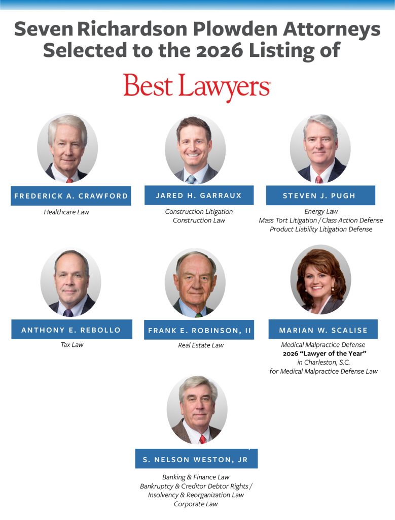 The 2026 edition of The Best Lawyers in America® features ten Richardson Plowden & Robinson, P.A. attorneys who were selected by their peers: Frederick A. Crawford for health care law; Jared H. Garraux for construction law and construction litigation; Steven J. Pugh for energy law, mass tort litigation defense, and product liability litigation defense; Anthony E. Rebollo for tax law; Frank E. Robinson II for real estate law; Marian W. Scalise for medical malpractice defense; and S. Nelson Weston, Jr. for Banking and Finance Law, Bankruptcy and Creditor Rights Law, and Corporate Law.
